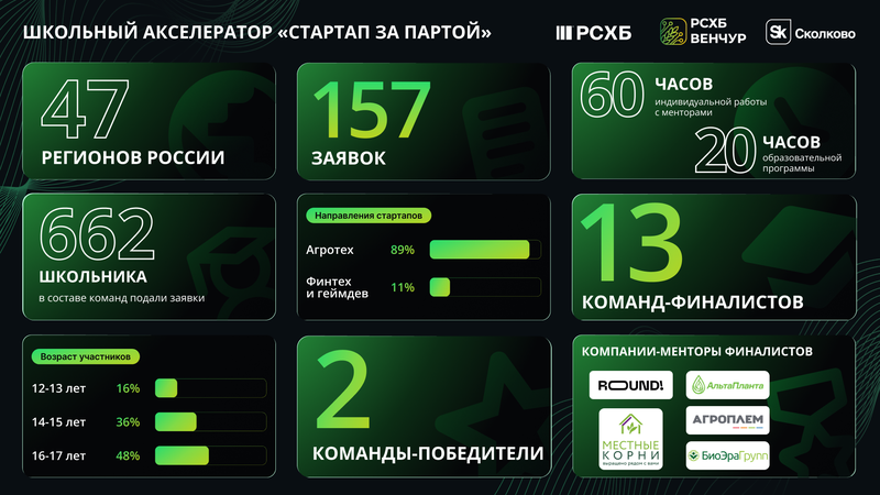 Завершился второй сезон акселератора «Стартап за партой» от Россельхозбанка и Сколково для школьников. В число финалистов вышли 13 лучших команд, которые в рамках демо-дня продемонстрировали свои проекты представителям экспертного жюри и инвестиционного сообщества. Программа, предназначенная для талантливой молодежи в возрасте от 12 до 17 лет, была направлена на поддержку идей новых технологических решений в области агротеха, финтеха и геймификации.