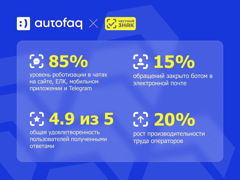 В результате внедрения AutoFAQ система «Честный знак» добилась 20%-го роста производительности труда операторов и 4-кратной окупаемости инвестиций за 10 месяцев эксплуатации в 2024 году.