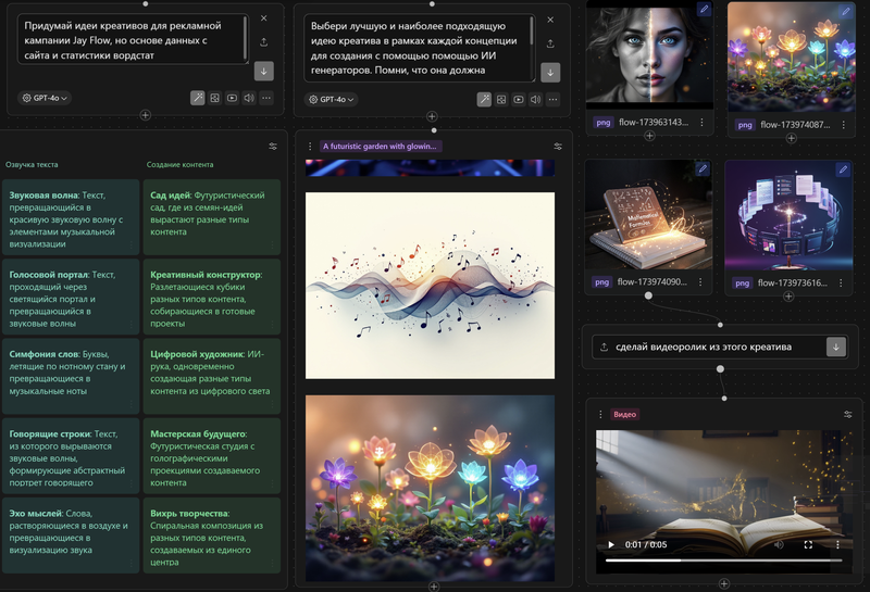 Уже сейчас Jay Flow — это гораздо больше, чем просто синтез разнообразного контента на бесконечном холсте. Есть возможность интегрироваться с любыми API, создавать мультиагентные системы и даже автоматизировать процессы.