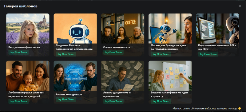 Да, такие планы есть. Мы хотим сделать Галерею не только местом для поиска вдохновения, но и платформой для обмена опытом. Пользователи смогут создавать и публиковать собственные шаблоны, помогая другим быстрее находить решения под свои задачи. Кроме того, мы уже запустили возможность создания собственных интеллектуальных агентов. В будущем экосистема Jay Flow и Галерея, в частности, будет активно расширяться за счет готовых решений для автоматизации и оптимизации рабочих процессов.