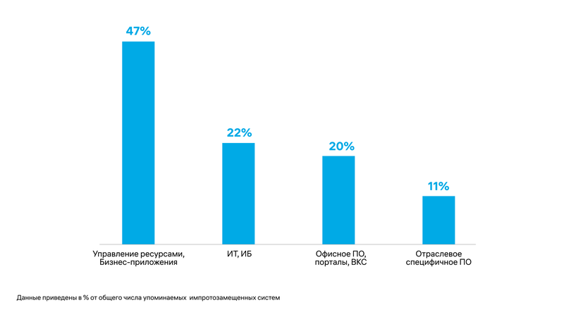 Импортозамещение отнюдь не выступает приоритетным направлением для отрасли: фактический уровень замещения варьируется от класса ПО: 47% в управлении ресурсами и бизнес-приложениях, 22% — в сфере ИТ и ИБ, 20% — в офисном и коммуникационном ПО, и лишь 11% — в специфичном отраслевом. Замещаются только те системы, использование которых стало невозможным или сопряжено с серьезными рисками.