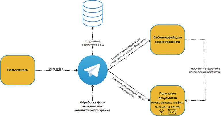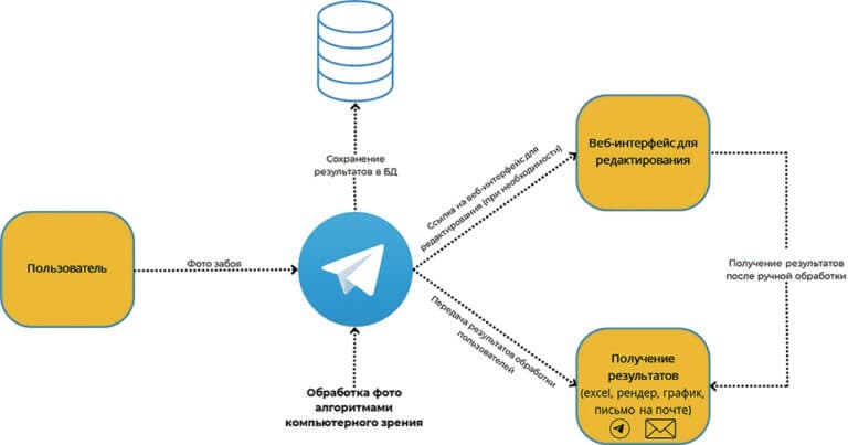 В общем виде архитектура Системы выглядит следующим образом (рис. 1). Сотрудник предприятия фотографирует забой с помощью планшета с подключенной к нему стереокамерой, фотографии отправляются через телеграм-бот на сервер, где происходит обработка изображений.