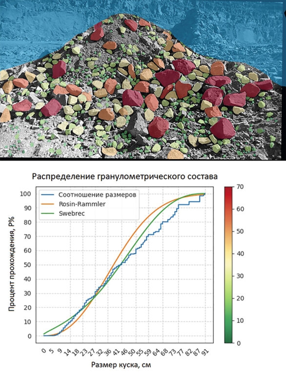 Также важной составляющей Системы является оперативное уведомление машиниста экскаватора о наличии негабаритов для планирования работы в течение смены. На рисунке 3 представлено распределение гранулометрического состава руды в забое согласно цветовому градиенту относительно фактических размеров кусков (соотношение размеров), а также моделей Rosin-Rammler и Swebrec.