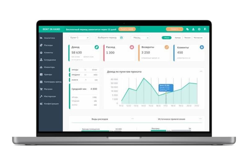 Мы не стали работать с 1С и другими продуктами для автоматизации бизнеса, так как механика и специфика работы в прокате отличаются от ритейла. В прокате нужно следить за оборотом и возвратом инвентаря, вести учет поломок, денег и контролировать сотрудников. Если не вести учет, потеря до 30% выручки из-за «леваков» и других причин, неизбежна.