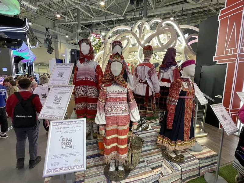 На стенде Калужского края в рамках международной выставки-форума «Россия» представлены несколько манекенов с народными костюмами, рядом с которыми размещены специальные QR-коды. При наведении смартфона на QR-код запускается показ костюма в формате дополненной реальности. Благодаря такой визуализации посетители стенда могут посмотреть, как носили костюм в XIX веке и окунуться в эпоху практически забытых традиций.