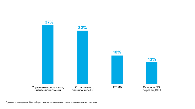 Процесс цифровизации в отрасли ускоряют два мощных стимула. Первый — это масштабная господдержка в размере 300 млрд рублей от Минпромторга, рассчитанная до 2030 года. Второй — жёсткие требования по импортозамещению для объектов КИИ. Как показало исследование, в целом опыт миграции на отечественные ИТ-решения имеет подавляющее большинство компаний (66%) отрасли обрабатывающей промышленности. Однако показатели уровня замещения сильно разнятся в зависимости от класса систем. Так, в сегменте ERP и бизнес-приложений он достигает 37%, 32% — в отраслевом ПО, 18% — в ИТ и ИБ-системах, и 13% — в офисных решениях, порталах и ВКС.