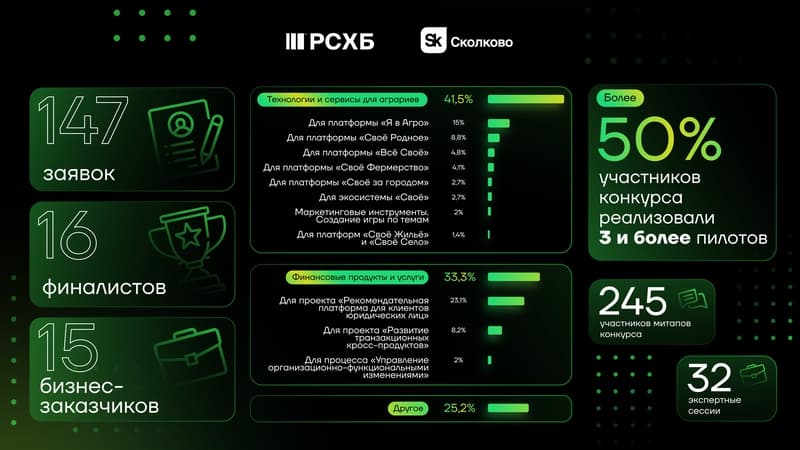 В финал акселератора вышли 16 команд*, доказавшие эффективность своих технологий и предложившие наиболее актуальные и перспективные разработки для АПК и финансовой отрасли. 22 декабря во время закрытого демо-дня состоялась питч сессия, на которой команды-финалисты смогли презентовать свои решения перед 15 бизнес-заказчиками Россельхозбанка и экспертами «Сколково». По её итогам будут выбраны стартап-решения, которые получат возможность запустить пилотный проект с экосистемой Своё и платформой «РСХБ в Цифре». Банк выделяет на каждый пилотный проект до 5 млн рублей.