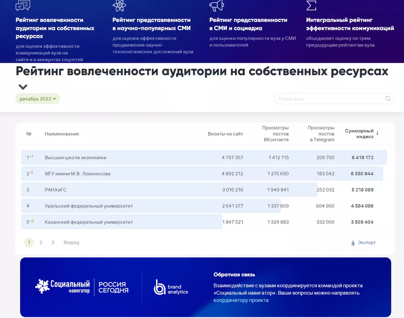 Проект «Социальный навигатор» международной медиагруппы «Россия сегодня» и система анализа социальных медиа и СМИ Brand Analytics представили во вторник линейку рейтингов результативности коммуникационных стратегий российских университетов. На первом этапе в рейтинги включен 270 вуз, подведомственный Правительству, Министерству науки и высшего образования и Министерству просвещения РФ.