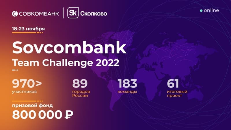 23 ноября Совкомбанк и Sk Fintech Hub подвели итоги командного онлайн-хакатона Sovcombank Team Challenge 2022. Более 970 IT-специалистов из 89 городов России прислали заявки на участие. Общий призовой фонд соревнования составил 800 тыс. рублей.