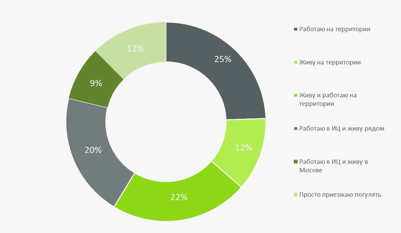 Среди тех, кто принял участие в опросе, 22,4% — работает на территории ИЦ, 10,9% — живет здесь, 20,4% — живет и работает в Сколково, 18,4% — работает в ИЦ и живет рядом, 8% — работает в ИЦ и живет в Москве, 11,4% — приезжает в ИЦ погулять и провести свободное время.