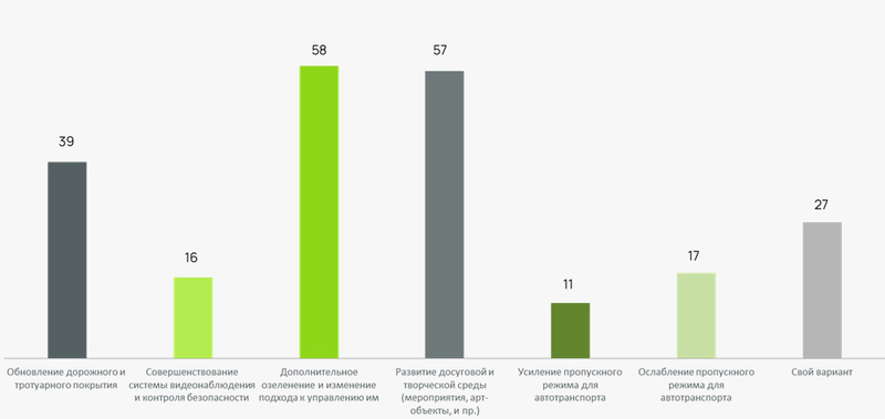 В числе наиболее популярных предложений по улучшению городской среды ИЦ «Сколково: дополнительное озеленение территории (58%), развитие досуговой и творческой среды (57%), обновление дорожного и тротуарного покрытия (39%), ослабление пропускного режима для автотранспорта, совершенствование системы видеонаблюдения и контроля безопасности (16%).