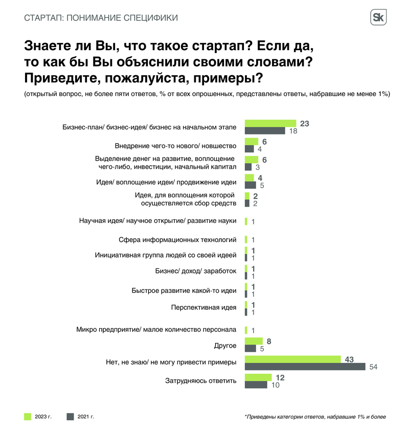 Проведенный опрос показал, что почти каждый второй респондент (45%, +9 п.п. к ноябрю 2021 г.) знает определение стартапа. Однако доля осведомленных значительно выше — часть опрошенных слышали это слово, но не смогли дать четкое определение. При этом доля осведомленных о понятии стартапа за 2 года показала значительный рост среди всех возрастных категорий.