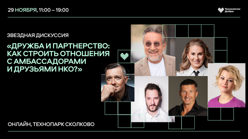 Присоединяйтесь к дискуссии на конференции «Технологии добра», которая состоится 29 ноября в Технопарке «Сколково» и онлайн, где известные амбассадоры фондов и эксперты из НКО обсудят, как сотрудничать с артистами, спортсменами и другими медийными личностями для привлечения ресурсов и развития культуры взаимопомощи.
